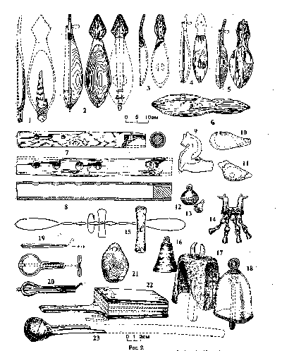 Номинальное число струнных инструментов, найденных в виде крупных частей или мелких деталей в 1992 г., достигло 65. Из них 30 шпеньков - это детали для натяжения струн (рис.1, 9, 10), сходство между гусельными и гудочными затрудняет их клссификацию.